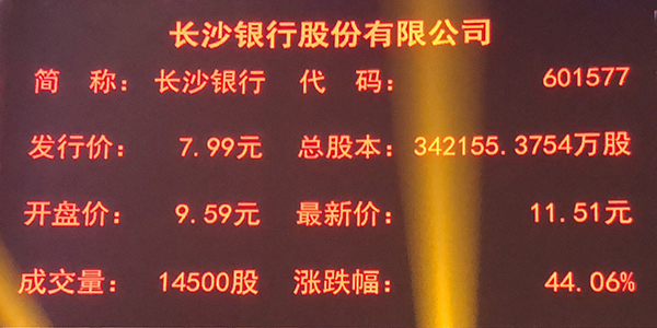 9月26日上午9時30分,隨著上市銅鑼的敲響,長沙銀行股份有限公司正式登陸上交所主板,股票代碼601577,成為湖南省首家A股上市銀行、A股第28家上市銀行。長沙銀行發(fā)行價為每股7.99元,開盤價每股9.59元,開盤后股價沖高至每股11.51元,大漲44.06%。