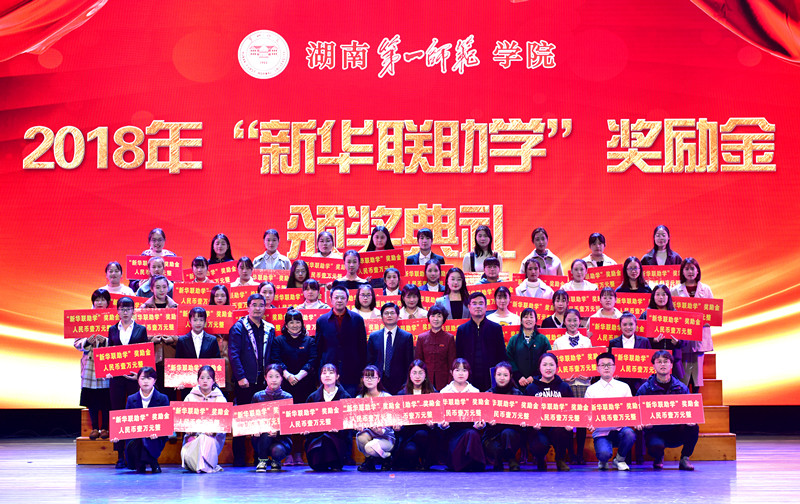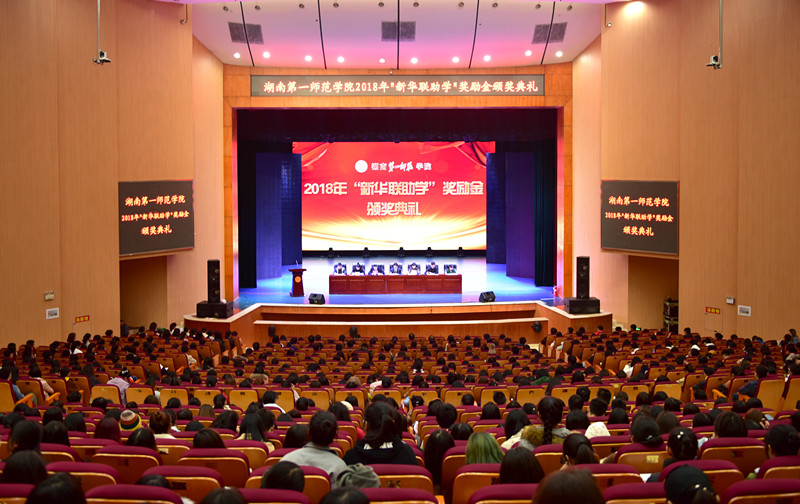 11月16日下午,湖南第一師范學(xué)院2018年“新華聯(lián)助學(xué)”獎勵金頒獎典禮在該校東方紅校區(qū)田漢劇場隆重舉行。集團(tuán)高級助理總裁、工會主席楊運(yùn)輝代表傅軍總裁出席頒獎典禮,并與湖南第一師范學(xué)院校長童小嬌、副校長劉宇等領(lǐng)導(dǎo)為曹茜雅等50名優(yōu)秀貧困大學(xué)生頒獎,每人獎勵10000元。來自該校的教育科學(xué)學(xué)院、外國語學(xué)院、商學(xué)院、文學(xué)與新聞傳播學(xué)院等多個學(xué)院的領(lǐng)導(dǎo)、老師和學(xué)生近1000人共同見證了頒獎活動。
