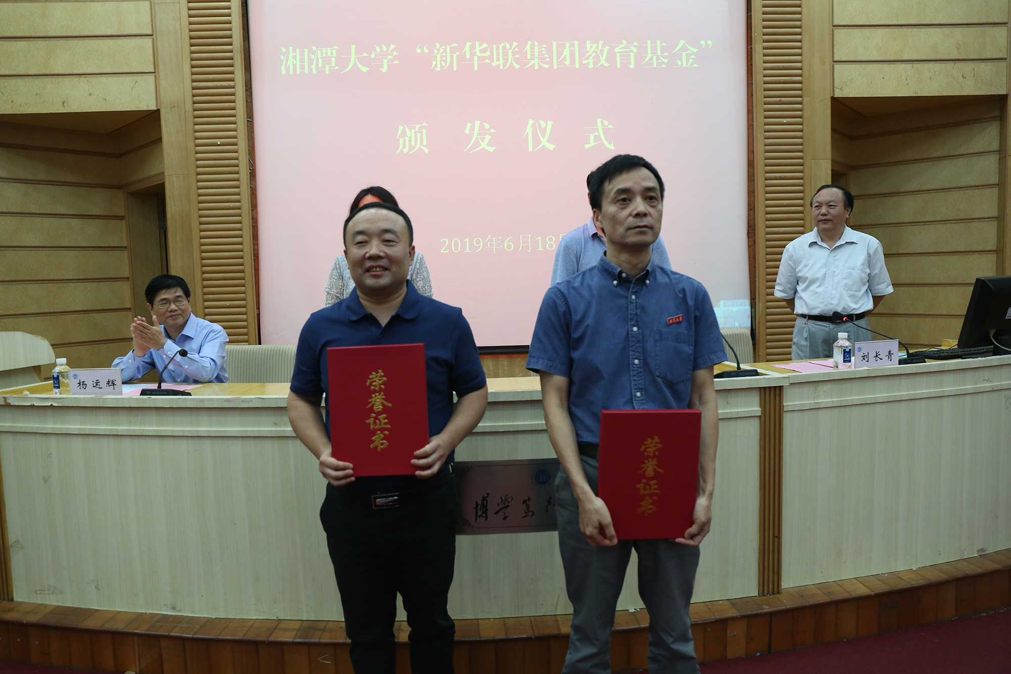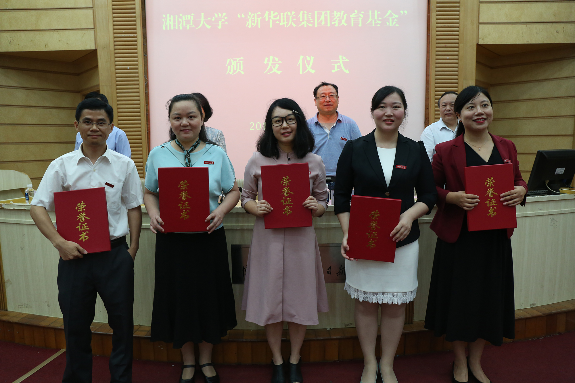 6月18日,湘潭大學(xué)首屆“新華聯(lián)集團(tuán)教育基金”頒獎(jiǎng)典禮在該校圖書館報(bào)告廳隆重舉行。新華聯(lián)集團(tuán)高級(jí)副總裁劉靜、高級(jí)助理總裁楊運(yùn)輝代表集團(tuán)出席此次活動(dòng),并與湘潭大學(xué)副校長(zhǎng)劉建平為楊華、戴友芝、朱礫等3位教師頒發(fā)了2018年“湘潭大學(xué)·新華聯(lián)杰出教學(xué)貢獻(xiàn)獎(jiǎng)”,每人獎(jiǎng)勵(lì)12萬(wàn)元;為孫豐國(guó)、李成福等2位教師頒發(fā)了2018年“湘潭大學(xué)·新華聯(lián)教學(xué)名師獎(jiǎng)”,每人獎(jiǎng)勵(lì)6萬(wàn)元;為鄔欣言、張偉偉、侯晟、揭嘉、王秀鋒等5位教師頒發(fā)了2018年“湘潭大學(xué)·新華聯(lián)青年教學(xué)標(biāo)兵獎(jiǎng)”,每人獎(jiǎng)勵(lì)2萬(wàn)元;為郭彩虹、李麗梅、張海雪等100名優(yōu)秀貧困大學(xué)生頒發(fā)了2019年“湘潭大學(xué)·新華聯(lián)集團(tuán)教育基金助學(xué)金”,每人獎(jiǎng)勵(lì)10000元。湘潭大學(xué)副校長(zhǎng)劉長(zhǎng)青與該校黨委辦公室、校長(zhǎng)辦公室、宣傳部等校屬有關(guān)部門負(fù)責(zé)人,各學(xué)院學(xué)生工作負(fù)責(zé)人,以及獲獎(jiǎng)教師、受助學(xué)生代表等300余人共同見證了頒獎(jiǎng)活動(dòng)。