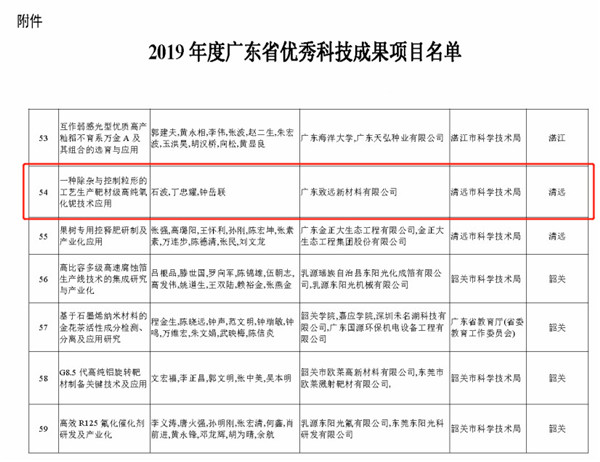 致遠新材多年來堅持科技創(chuàng)新,成果顯著。其研發(fā)的“一種除雜與控制粒形的工藝生產靶材級高純氧化鈮技術應用”項目被評為“2019年度廣東省優(yōu)秀科技成果項目”,并獲得“2019年度廣東省優(yōu)秀科技成果獎”。該項技術應用于靶材級高純氧化鈮產品生產線,解決了氧化鈮粉體粒度分布范圍廣和一致性差的問題,大大提高了國內氧化鈮產品的檔次及工藝水平。